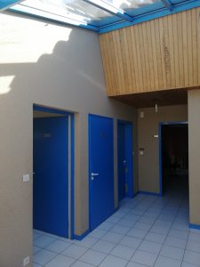 Bardage Bacacier 3S de Philippe STARCK! Posé en intérieur dans des bureaux, avec l’escalier en béton ciré Porte coulissante « esprit vieux portail de ferme » pour accéder aux sanitaires…