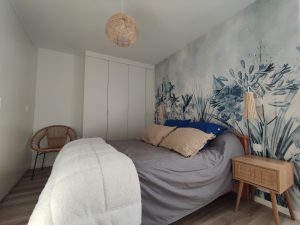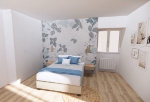 Retrait de l’ensemble des supports (murs, sol, plafond). Nouvelle implantation plus fonctionnelle : grand dressing (devant le lit + sur le côté), tête de lit en papier peint et sol vinyle dry back.